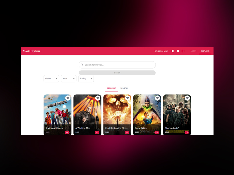 The Movie Explorer App is a React-based web application that allows users to search for movies, view trending films, and see detailed movie information. It fetches real-time data from the TMDb API, including titles, ratings, genres, trailers, and more. Users can log in, switch between light/dark mode, and save their favorite movies locally.