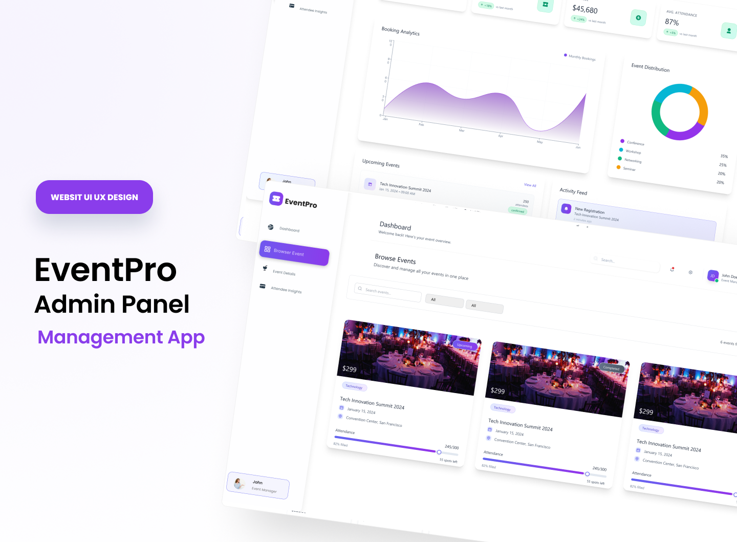 EventPro is a modern Admin Panel UI/UX concept for seamless event management. It provides a clean and intuitive interface for event organizers to manage bookings, analyze attendance data, track revenue, and monitor event performance in real-time.